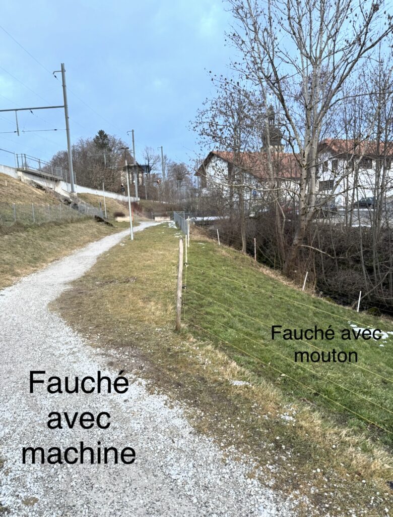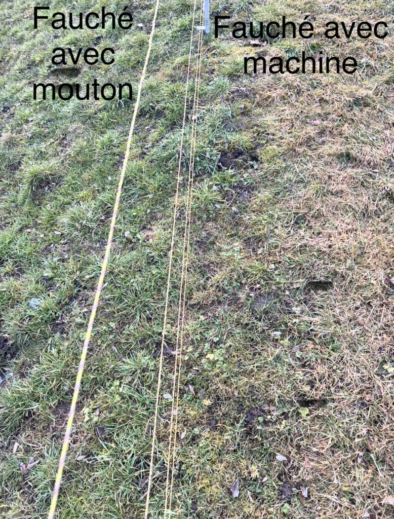 Sur cette image on voit aussi bien le résultat et que l’herbe est à la même hauteur de coupe. Photo prise le 25 Janvier